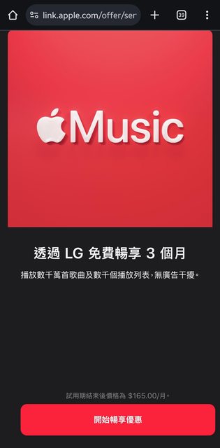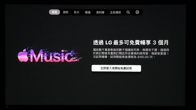 LG近期宣布為旗下2018年以後推出的電視追加Apple Music播放 Dolby Atmos 空間音樂的功 能 目前此功能已推出,並同時贈送3個月Apple Music試用資格以享受新功能 在LG電視的應用程式商店就可以看到優惠廣告 https://i.imgur.com/w8Oi1d5.jpeg