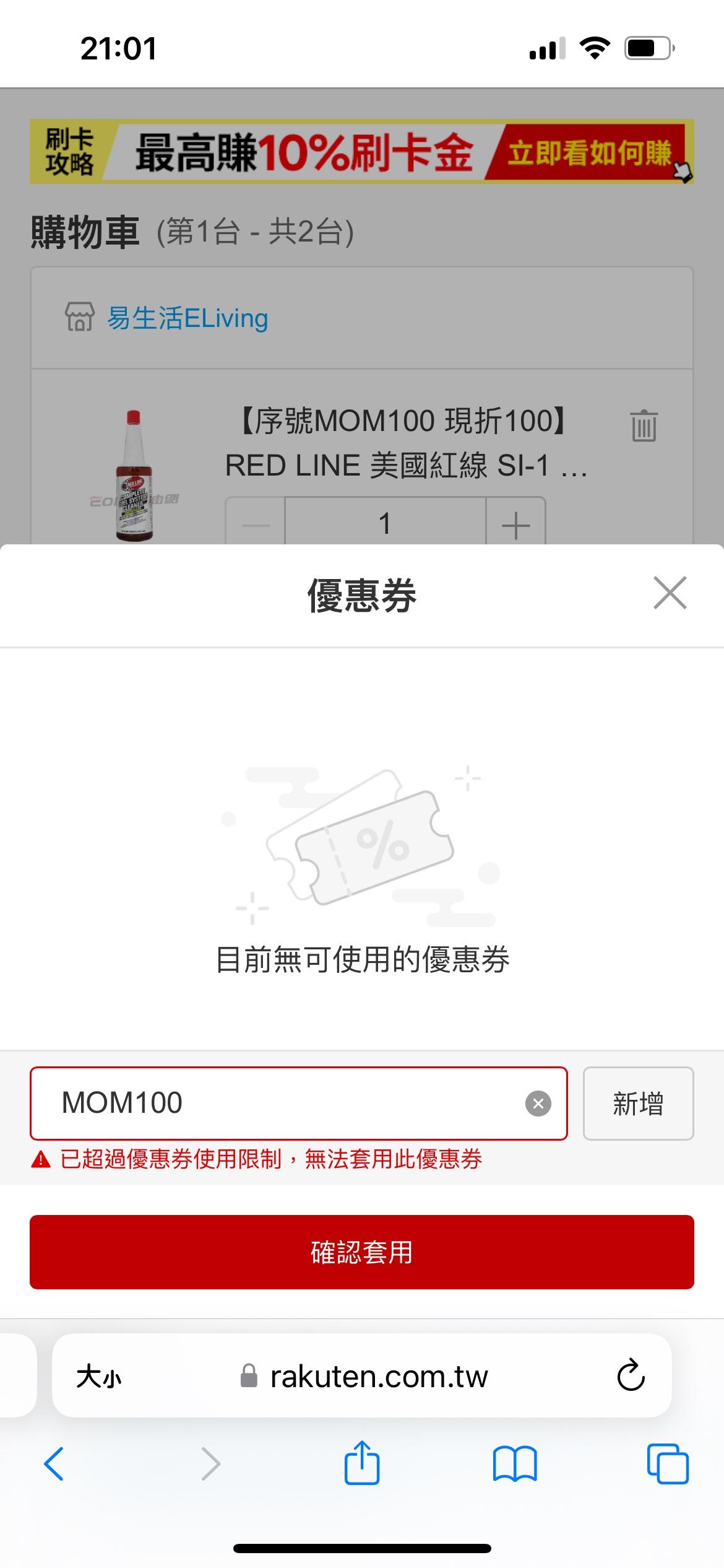 聽說加到汽油裡面效果好像不錯? 剛好有折扣券可以領還有9%點數回饋 折扣後 $299 免運 折扣碼:MOM100 https://www.rakuten.com.tw/shop/eliving/product/3620200-1/ -- ※ 發信站: 批踢踢實業坊(www.ptt.org.tw), 來自: 106.64.40.253 (臺灣) ※ 文章網址: https://www.ptt.org.tw/Lifeismoney/M.1715163530.A.22E