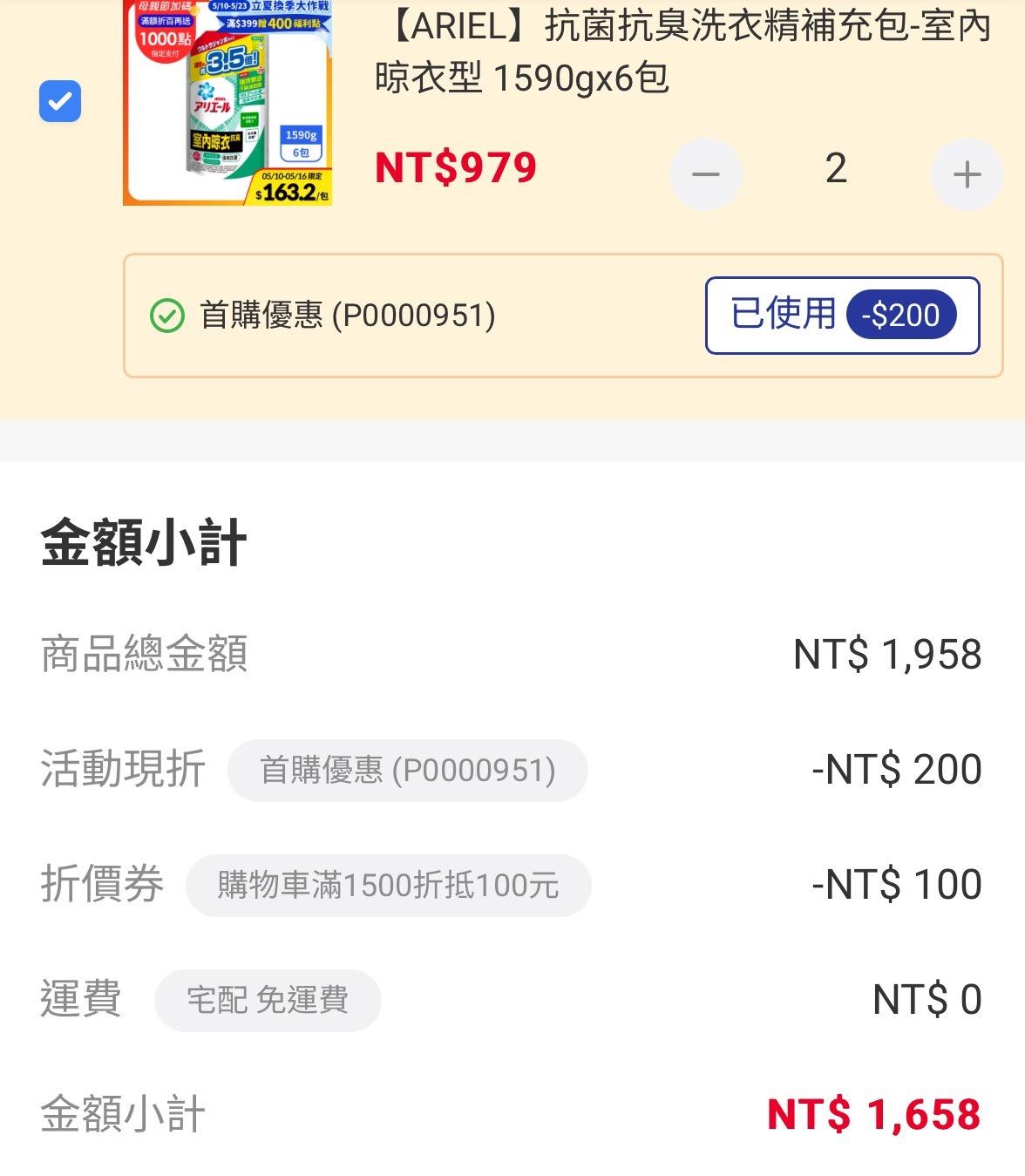 已有版友在推文補充 家樂福也有特價$981 比全聯貴$2 但多送倍潔雅好韌真3層抽取衛生紙100抽6包乙袋.不累送(這價值應該有$70吧?) 如果有在用導購的也別忘了 5/12_Line購物3% 5/12_shopback 12% 有些信用卡或支付有額外回饋就不贅述 (cube.玫瑰giving.樂天) https://imgur.com/a/QKFF1dB 【家樂福】 【箱購較划算】ARIEL超濃縮抗菌洗衣精補充包1590G(5/8-5/19 箱購活動, 請下6件) https://online.carrefour.com.tw/zh/ariel/1110333700101 但老實說我是買全聯小時購 因為首購再折200太香 https://imgur.com/a/1lmf2vJ 謝謝收看 -- ※ 發信站: 批踢踢實業坊(www.ptt.org.tw), 來自: 27.147.1.18 (臺灣) ※ 文章網址: https://www.ptt.org.tw/Lifeismoney/M.1715451213.A.0E9