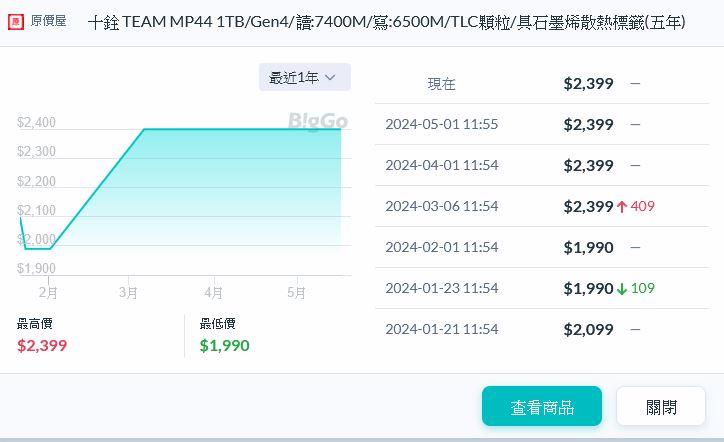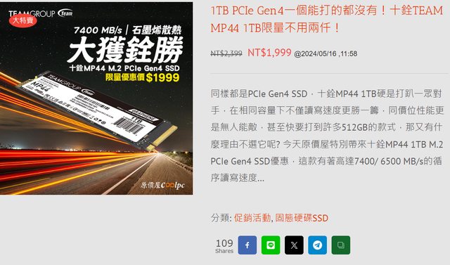 前幾天才在說不要買QLC,現在馬上就殺下來TLC,說好漲價都是騙人ㄉ $2399↘$1999,蝦皮$2099,還有限制數量 等到18號蝦皮發券應該會更便宜,分享給各位參考 https://i.imgur.com/GFD1aV0.jpg
