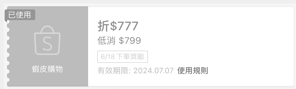 → netman: 不適用,這樣的券有799-777、777蝦幣跟滿2 223.136.89.44 07/07 15:45