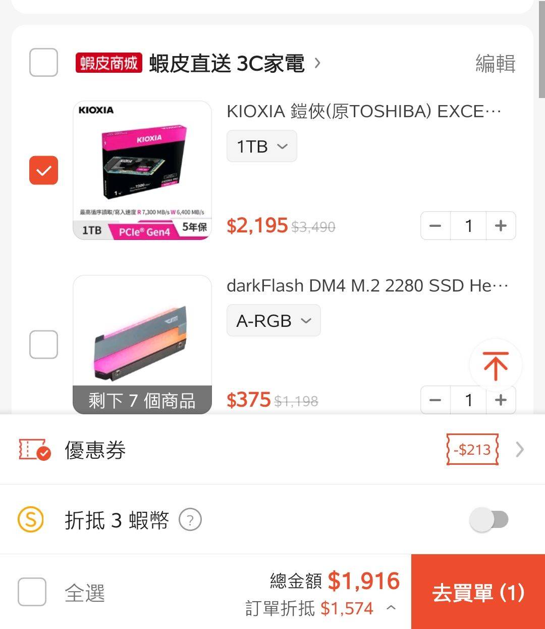 又又又來了拉,上次沒搶到可惡QQ 這次10銓一樣放福利,上次看到別人PO文隔天直接蝦皮缺貨 隔兩天去門市也都沒有貨了,搞限量這套真的很狠 大概在原價屋估計系統比過了,1TB 讀寫7000MB/S SSD內最便宜的就是他了 遊戲、系統、資料存取都好用,逛了一下電蝦版評價也都不錯 便宜治百病(誤 搞不好25號蝦皮會員日配合折價券一波更便宜~ 分享給各位參考了~ https://is.gd/5Hwb2T https://i.imgur.com/4WoIPDt.png