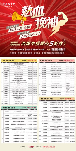 活動日期:8/21~9/2 活動內容: 台北、高雄8/23~8/24 新竹、台中 8/30~9/2 至指定捐血點捐血者贈送西堤牛排五折卷 *每日每捐血地點前25名(首捐或是捐500CC者)另外曾送野餐墊一張 https://i.imgur.com/5VMynnV.jpg