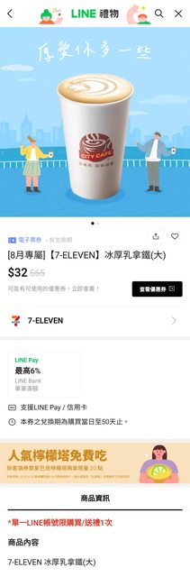 本來是要買1+1的冰卡布奇諾,但似乎先行下架了,完全看不到。 然後發現多了大杯冰厚乳拿鐵32元,比買一送一還稍稍稍便宜一些;不過單一LINE帳號只能 購買/送禮一次。 這款有人愛有人不愛XD分享給需要的人,祝喝得愉快^_^ https://liff.line.me/1429440178-lwY6XWYD/voucher/322176563 https://i.imgur.com/RsiFCOk.jpeg