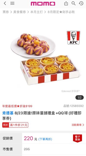 本來想買麥當勞滿福堡的後來看到這個組合還蠻划算的,Momo 肯德基 8/23限搶!原味蛋 撻禮盒+QQ球(好禮即享券)。這個組合等於買蛋撻送QQ球的概念,QQ球沒有夜市的好吃, 有喜歡的版友可以入手,不知道有沒有限量就是了。 https://i.imgur.com/V4NwGyc.jpeg