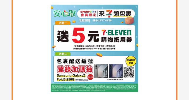 1)自2024/8/17~8/30 23:59止OPENPOINT會員取件送5元購物抵用券,數量有限,送完為止