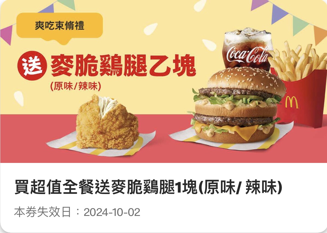 推 Anadyomene: 我是抽到買套餐送麥脆雞腿 36.224.91.49 09/27 11:22