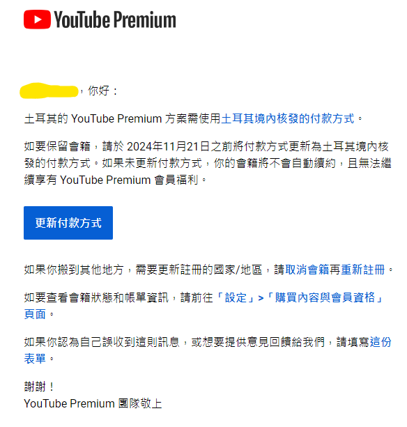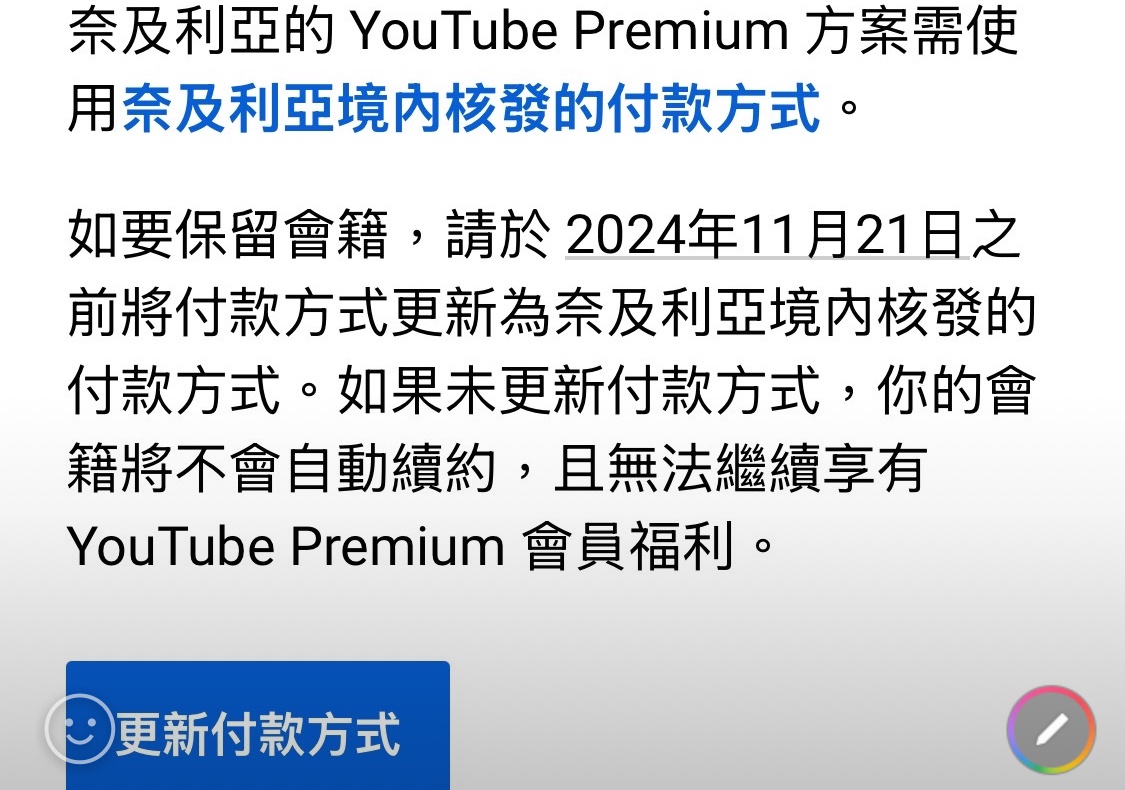 一早就收到信件通知 下個月開始要跟土耳其一樣限用當地信用卡 看來沒辦法繼續當榮譽阿根廷人了 至於還有什麼地區接受榮譽國民目前還不清楚 但看來限用當地信用卡會是未來google廣泛的做法QQ 請各位榮譽阿根廷人做好衝擊準備 RIP ----- Sent from JPTT on my iPhone -- ※ 發信站: 批踢踢實業坊(www.ptt.org.tw), 來自: 116.241.114.176 (臺灣) ※ 文章網址: https://www.ptt.org.tw/Lifeismoney/M.1729649031.A.7C4