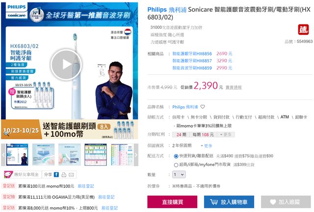 momo 飛利浦電動牙刷 HX6803/02 今天特價 2390,送 8 支原廠護齦刷頭 https://i.imgur.com/6QTRQ8P.png