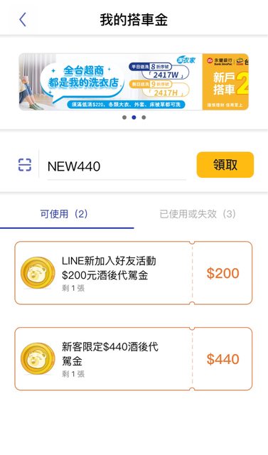 實測帳號只要沒叫過代駕就算有叫過計程車也能用 優惠碼NEW440 https://i.imgur.com/Jr8SJYp.jpeg