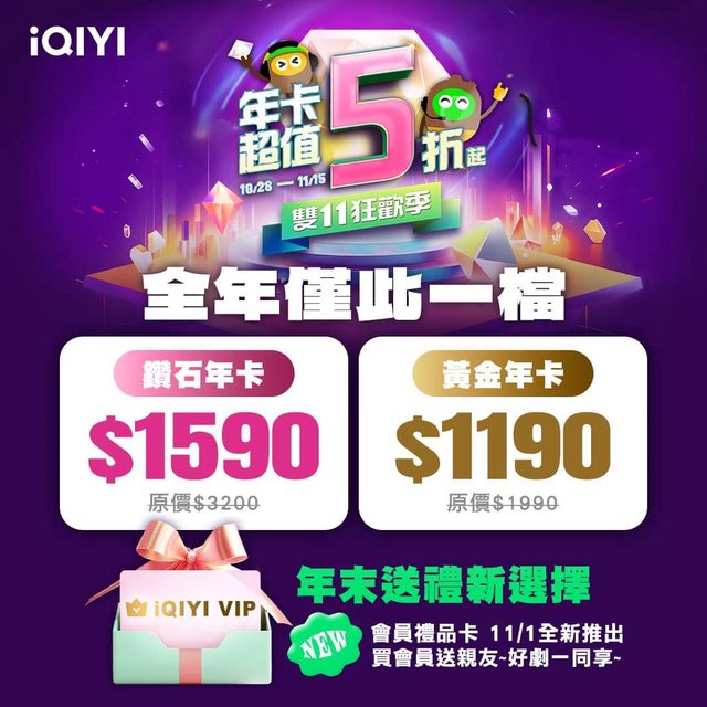 雙11方案出來了 鑽石12個月 NT$ 1590 黃金12個月 NT$ 1190 https://i.imgur.com/DQFjikV.jpeg