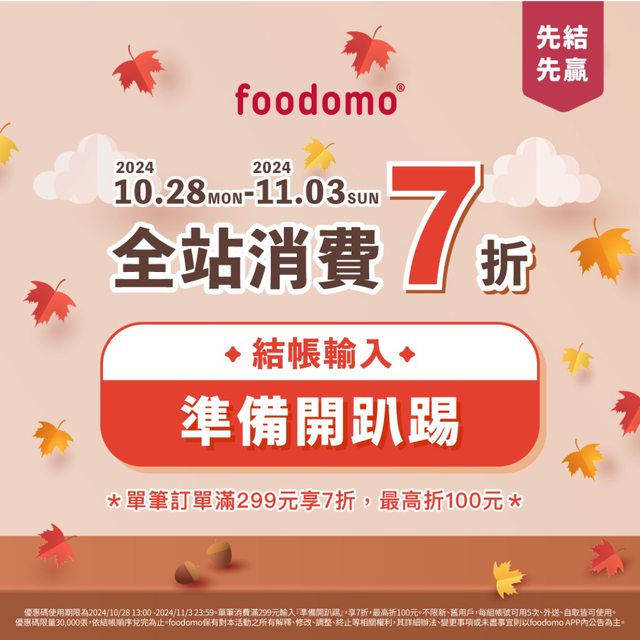 去年買了特價的Foodomo會員之後,每個月都在等很殺的折扣搭配著用,這次算是很不錯 了 10/28-11/03 輸入優惠碼「準備開趴踢」領優惠券 滿299享7折,上限100 https://i.imgur.com/W1Js6UN.jpeg