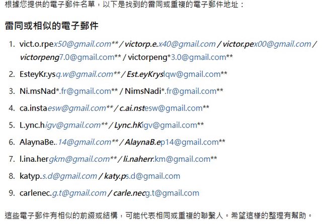 根據您提供的數據,以下是整理出來的重複或相似的名字及相對應的電子郵件: