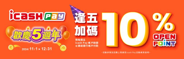 活動連結:https://www.icashpay.com.tw/event/5thanniversary/index 活動期間:2024/11/1 ~ 2024/12/31 活動內容: 【每週五筆筆10%回饋】 icash Pay (限icash Pay帳戶餘額/連結銀行帳戶付款)週五於全通路消費, 加碼10%OPENPOINT (活動期間每戶回饋上限50點,每月總贈點上限250萬點) 【新戶月月抽 iPhone16】 活動期間內首次註冊icash Pay之新用戶,註冊當月使用icash Pay交易1元(含)以上, 即可獲得當月iPhone 16 128GB抽獎機會,每新戶僅限乙次抽獎機會。 獎項:iPhone 16 128GB *3支(每月送出1支,顏色隨機出貨不挑色,市值$29,900) *每月中獎名單將於次月底前公告於icash Facebook粉絲團,如10月中獎名單於11月底前 公告。 *為保障得獎者兌獎權益,得獎者需於2025/1/31前完成領獎手續。 【新戶再享100%回饋】 註冊當月使用icash Pay交易之「首筆」1元(含)以上之消費金額,可享該筆金額 100%OPENPOINT回饋,活動期間每戶回饋上限80點,每戶限回饋乙次, 每月活動總贈點上限90萬點。 活動都到年底 不限通路 這次週五滿500回饋10%拿滿50點 通路這邊看:https://www.icashpay.com.tw/index/cochannel/cpcId/2 -- ※ 發信站: 批踢踢實業坊(www.ptt.org.tw), 來自: 42.79.145.181 (臺灣) ※ 文章網址: https://www.ptt.org.tw/Lifeismoney/M.1730272255.A.A17