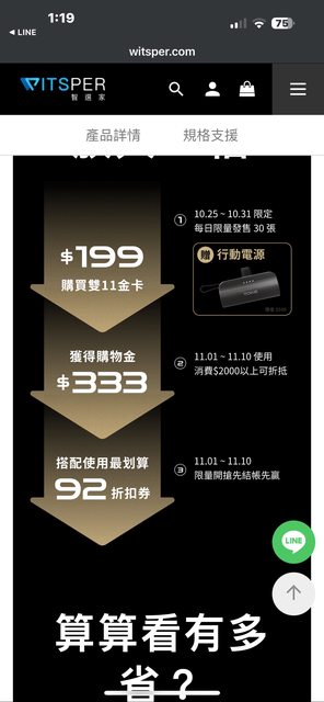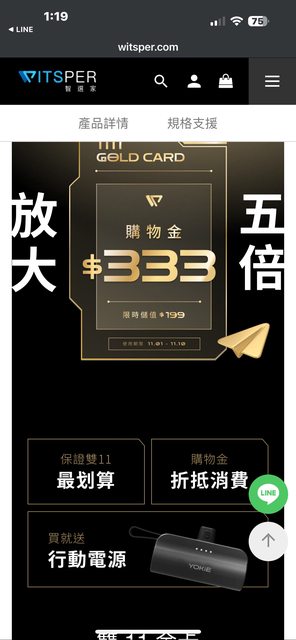 智選家儲值金333然後賣199 有送行動電源 雙11有打折 剛好有要買耳機或行動電源之類的應該還算划算 https://www.witsper.com/products/goldcard https://i.imgur.com/NfjVJpW.jpeg