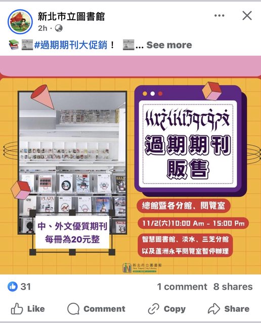 過期期刊大促銷! 本年度最後一次的 過期期刊販售 就在明天( 11/ 2), 無論你是熱愛閱讀的書迷,還是喜歡尋找獨特收藏的寶藏獵人, 這次活動都不容錯過,快來挑選你心儀的期刊,把握這個超值機會, 尋找屬於你的閱讀寶藏! 物超所值:每冊只要20元!是的,你沒看錯,僅僅20元! 內容豐富:一般/兒童,各類型中、外文優質刊物應有盡有。 限量特惠:總館及各分館限量供應,搶購從速! 活動詳情及販售清單>>https://is.gd/NeUrgz - --------【過期期刊販售】活動資訊----------- 時間│ / (六) : ~ : 地點│總館暨各分館及閱覽室 內容│販售各館已逾保存期限之過期期刊,每冊20元整 特別提醒:智慧圖書館、淡水分館、蘆洲永平圖書閱覽室整修閉館及三芝分館暫不辦理。 珍愛地球,自備環保購物袋及零錢共襄盛舉 -- ※ 發信站: 批踢踢實業坊(www.ptt.org.tw), 來自: 223.137.108.227 (臺灣) ※ 文章網址: https://www.ptt.org.tw/Lifeismoney/M.1730441996.A.EE3