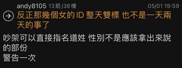 → lmf770410: 強調性別 再去批評 在這種只看得到ID的PTT再刻意提性 09/24 23:04