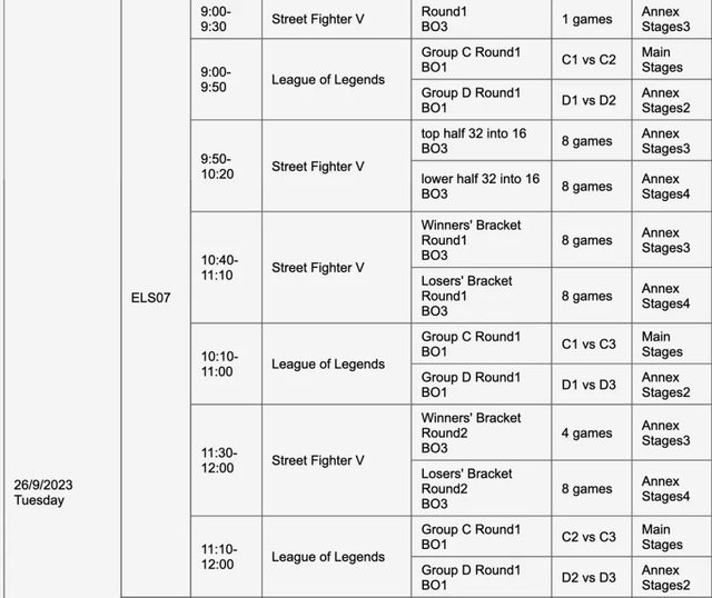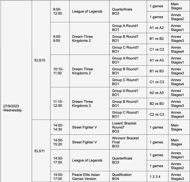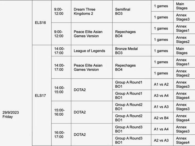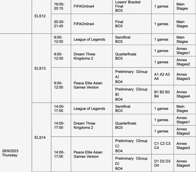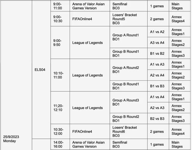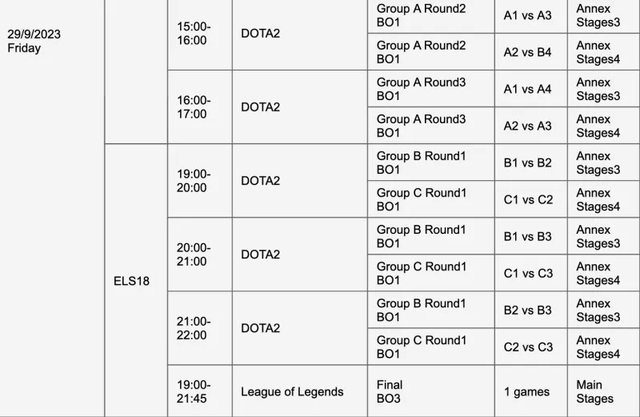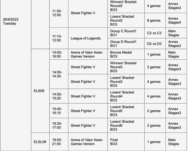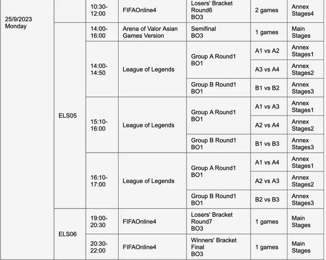 如題 杭州亞運官方公布了各電競項目的賽程,其中也包含了英雄聯盟 小組賽包含 ABCD 四個小組,每個小組四支隊伍,其中的兩支隊伍能夠晉級八強 而淘汰賽階段(八強到總決賽)全部都是打 Bo3 以下是詳細賽程 9/25 9:00~9:50 小組賽 A1 vs A2、A3 vs A4、B1 vs B2 10:10~11:00 小組賽 A1 vs A3、A2 vs A4、B1 vs B3 11:20~12:10 小組賽 A1 vs A4、A2 vs A3、B2 vs B3 14:00~14:50 小組賽 A1 vs A2、A3 vs A4、B1 vs B2 15:10~16:00 小組賽 A1 vs A3、A2 vs A4、B1 vs B3 16:10~17:00 小組賽 A1 vs A4、A2 vs A3、B2 vs B3 9/26 9:00~9:50 小組賽 C1 vs C2、D1 vs D2 10:10~11:00 小組賽 C1 vs C3、D1 vs D3 11:10~12:00 小組賽 C2 vs C3、D2 vs D3 9/27 9:00~12:00 八強賽 14:00~17:00 八強賽 9/28 9:00~12:00 四強賽 14:00~17:00 四強賽 9/29 14:00~17:00 銅牌戰 19:00~21:45 總決賽 -- Sent from BePTT on my Sony J9210 -- ※ 發信站: 批踢踢實業坊(www.ptt.org.tw), 來自: 111.71.212.158 (臺灣) ※ 文章網址: https://www.ptt.org.tw/LoL/M.1691478788.A.5DE