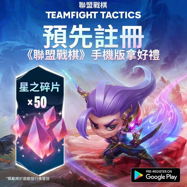 聯盟戰棋FB: https://reurl.cc/4oxnMV 《聯盟戰棋》手機版即將在亞太地區發行! 即日起進行預先註冊即可獲得超讚的獎勵,包括50塊星之碎片 正式發行日期將於日後公布,別忘了關注我們的專頁以掌握最新資訊,還有機會獲得其他 里程碑獎勵喔! - 馬上預先註冊:http://preregister.teamfighttactics.leagueoflegends.com - *獎勵將於遊戲上市後發放 *使用iOS系統的玩家們請先至以上網站加入預先註冊的行列,App Store預先註冊開放 時,我們也會在社群媒體公布最新資訊,敬請期待! https://i.imgur.com/krcc5Uw.jpg