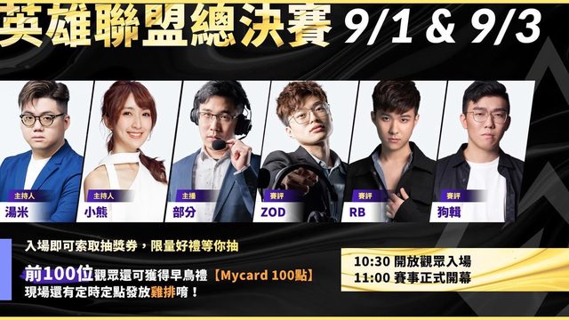 https://reurl.cc/jDbdmL 亞洲盃線下總決賽陣容正式公布 所有觀眾免費入場!千萬不要錯過~ 英雄聯盟總決賽:9/1(五)、9/3(日) 特戰英豪總決賽:9/2(六) 地點:板橋體育館(新北市板橋區中正路8號) 時間:10:30 開放入場,11:00 比賽正式開幕 當天除了有精彩賽事,週邊還有許多活動等你來參與! 觀眾入場即可索取抽獎券,完成指定活動就能參加抽獎,精美好禮等你來抽! 現場有吃有玩又有得拿, 暑期最熱血賽事,一起來參加吧 1. 巴龍的祝福(早鳥禮):前一百名來到現場觀眾即可獲得 Mycard 100點。 2. 藍爸爸的加持(闖關禮):現場體驗各式 VR、AR、電競和直播內容,蓋章集點即可獲得抽獎 資格。 3. 紅爸爸的重擊(參加禮):每天下午兩點後,由 Coser 發放號碼牌給前 100 位觀眾領取香 噴噴雞排! 4. 府中商圈強力加碼:出示豐富好康府中商圈圖,或與地景打卡經工作人員確認後提供商圈 圖,即可在合作商家處獲得優惠內容。 5. Dress code 禮:民眾穿戴與電競遊戲相關的服飾,可免費獲得新北幣 100 點(3 天共 15 0 份,數量有限換完為止)。 https://i.imgur.com/1PCOkMi.jpg