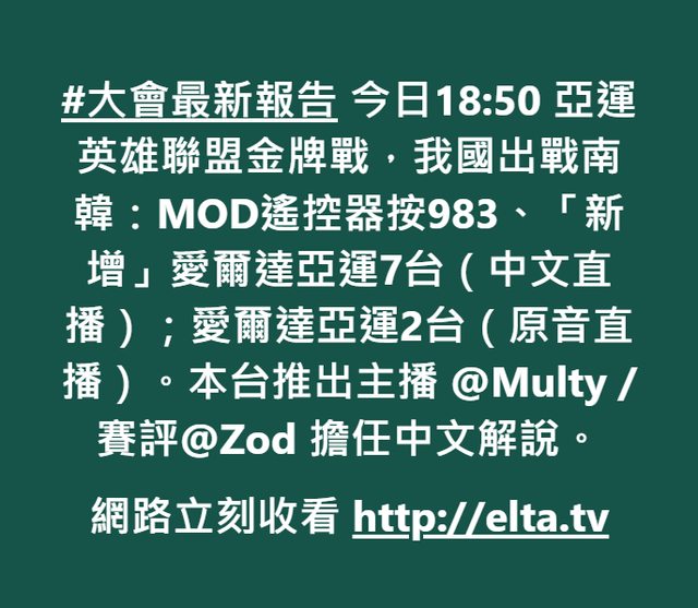 #大會最新報告 今日18:50 亞運英雄聯盟金牌戰,我國出戰南韓: MOD遙控器按983、 「新增」愛爾達亞運7台(中文直播); (需訂閱觀看) 愛爾達亞運2台(原音直播)。 本台推出主播 @Multy / 賽評@Zod 擔任中文解說。 網路立刻收看 http://elta.tv ------ 各位沒電視只有網路的訂閱仔們 愛爾達確定有網路中文直播啦 在亞運7台 感謝駐版人員有聽到大家的心聲 -- ※ 發信站: 批踢踢實業坊(www.ptt.org.tw), 來自: 60.248.124.155 (臺灣) ※ 文章網址: https://www.ptt.org.tw/LoL/M.1695980276.A.3F8