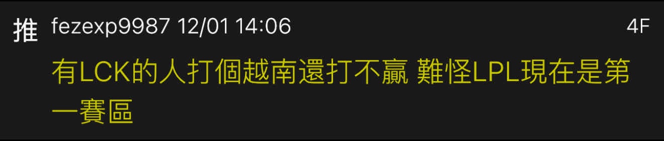 fezexp9987 : 有LCK的人打個越南還打不贏 難怪LPL現在是第一賽區 12/01 14:06