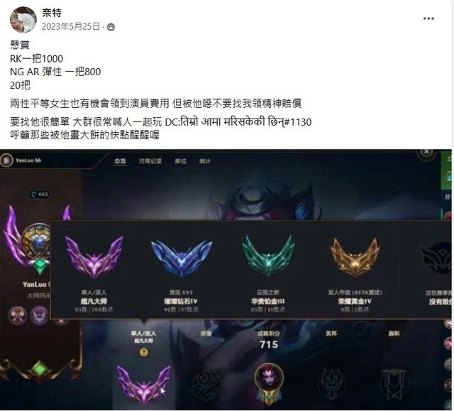 : 然後奈特還常常在小大(LOL圈社團) 有人跟他吵架 或戳過他的 會拿新台幣懸賞 一把6-8