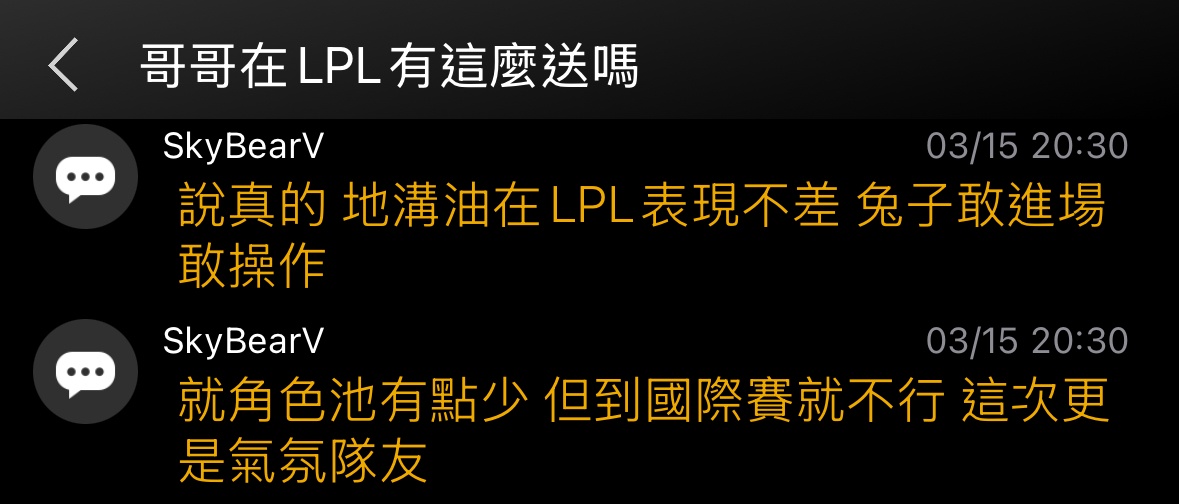 → SkyBearV : 差距最大的是地溝油 跟在LPL完全不是同一個人 03/15 20:25