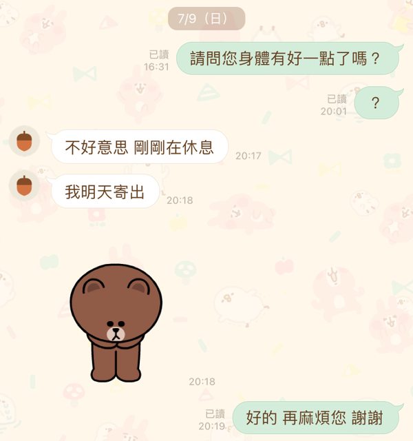 → CrystalSugar: 體仍不舒服 所以沒主動聯繫)即 有告知週一寄出 週 07/12 21:12