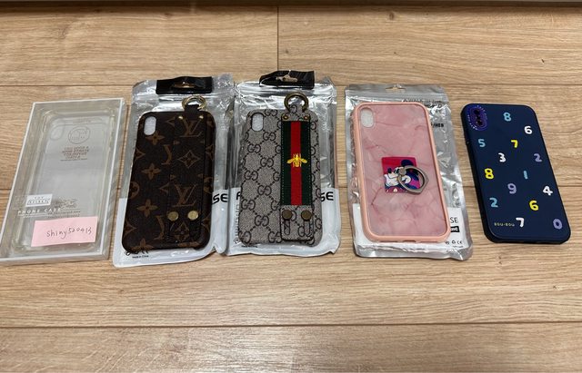 附贈五個手機殼(從左至右,包含三個全新手機殼、一個二手的犀牛盾、一個二手的sou
