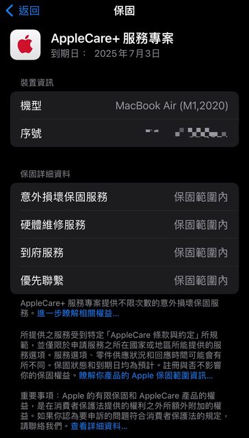 AppleCare+ 保固至2025/07/03