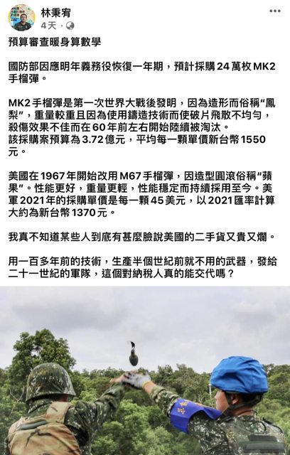 先不看詭異人物發言,其實林議員質疑的部分有營養多了 花更貴的錢買沒人在用100多年前的東西 不會也是因為一定要給國軍訂單吧 為了一定要給軍備局發獎金強迫大家用品質有問題的東西 國防部思考是不是怪怪的 = 預算審查暖身算數學 國防部因應明年義務役恢復一年期,預計採購24萬枚MK2手榴彈。 MK2手榴彈是第一次世界大戰後發明,因為造形而俗稱“鳳梨”,重量較重且因為使用鑄造技術而使破片飛散不均勻,殺傷效果不佳而在60年前左右開始陸續被淘汰。 該採購案預算為3.72億元,平均每一顆單價新台幣1550元。 美國在1967年開始改用M67手榴彈,因造型圓滾俗稱“蘋果”。性能更好,重量更輕,性能穩定而持續採用至今。美軍2021年的採購單價是每一顆45美元,以2021匯率計算大約為新台幣1370元。 我真不知道某些人到底有甚麼臉說美國的二手貨又貴又爛。 用一百多年前的技術,生產半個世紀前就不用的武器,發給二十一世紀的軍隊,這個對納稅人真的能交代嗎? https://i.imgur.com/9Ff28uf.jpg