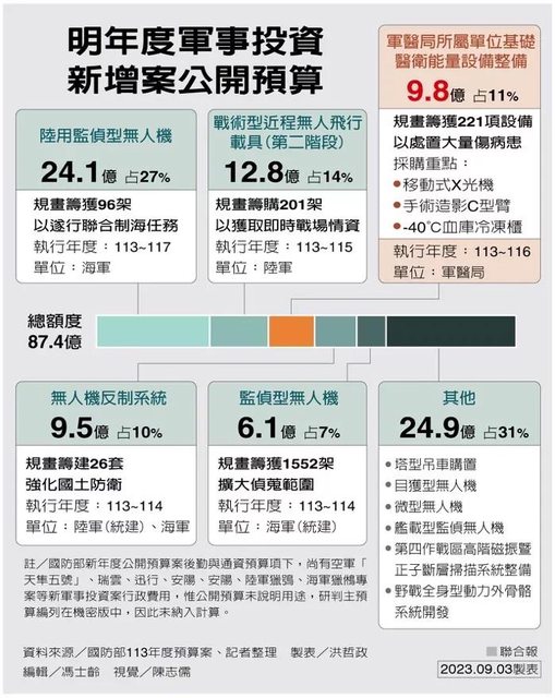 國防部表示明年軍事投資新建案約192億,而公開預算中新建案大約是30.5億 也就是有160億以上是被列入機密預算, 對美軍購的部份大概要等美方宣佈後才會轉公開吧? 明年公開預算新建案大部份是商規軍用無人機和無人機反制系統 另外還有幾個新出現的專案名稱,提供了一些閒嗑牙的題材 ——————————————————————— 陸軍 《戰術型近程無人飛行載具(二階段)》: 113-115年,201架共12億8016萬 113年85架5億6226萬 陸軍《微型無人機》: 陸軍統籌建案113-114年共12億8392萬 陸軍 113年320架2億7284萬 空軍 113年 315架2億8496萬 陸軍 《目獲型無人機》: 113-114年 72架共5億6660萬 113年42架3億3049萬 陸軍《無人機反制系統》: 陸軍統籌建案113-114年共9億8964萬 陸軍113年12套4億5678萬 海軍113年 3800萬 海軍 《陸用監偵型無人機》: 113-117年,96架共24億1472萬 113年12架3億零180萬 海軍 《艦載型監偵無人機》: 113-114年,16架共4億2468萬 113年4架1億零617萬 海軍《監偵型無人機》: 海軍統籌建案113-114年共9億9837萬 海軍113年155架9971萬 海軍 《塔型吊車購置》: 113-115年共6億1623萬 113年66萬 軍備局 《野戰全身型動力外骨骼系統開發》: 113-116年共1億3700萬 113年3500萬 軍醫局 《軍醫局所屬單位基礎醫衛能量設備整備》: 113-116年共9億8634萬 113年2億5743萬 軍醫局 《生物防護研究》: 113-117年共9億5409萬 113年2億1119萬 軍醫局 《第四作戰區高階磁振暨正子斷層掃描系統整備》: 113-114年共1億8700萬 113年9200萬 ———————————————————— 以下是幾個只有名字的專案: 天隼五號:空軍 (對美軍購NASAMS防空系統?) 獵鶚專案:陸軍、憲兵 獵鵂專案:海軍 (「獵鶚」猜測為增購刺針飛彈, 「獵鵂」會是海軍陸戰隊採購陸劍二嗎?) 安陽計劃:空軍 (?) 瑞雲專案:陸軍、海軍、憲兵 (?) 迅行專案:陸軍、海軍、空軍、資通電軍 (迅安系統升級案?Link-22?) -- ※ 發信站: 批踢踢實業坊(www.ptt.org.tw), 來自: 42.79.157.180 (臺灣) ※ 文章網址: https://www.ptt.org.tw/Military/M.1693829032.A.389