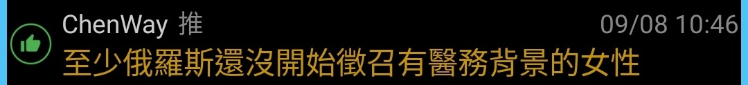ChenWay : 至少俄羅斯還沒開始徵召有醫務背景的女性 09/08 10:46