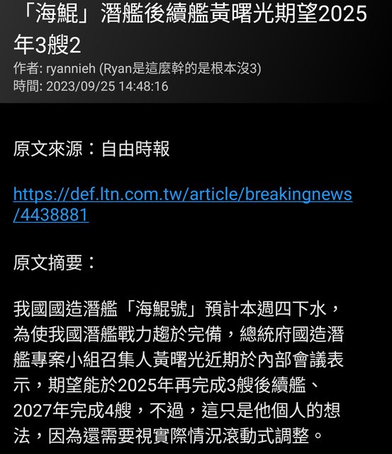本文引援自中夭所述: 2025完成3艘潛艦 大內宣出包 https://www.chinatimes.com/newspapers/20230927000471-260118?chdtv 昨午,中央社發布「校正公電」,所謂3艘國造潛艦,是指「1新2舊」。國防部長邱國正 昨日表示,黃曙光很認真,國防部樂觀其成。 ...... 總統府日前邀請特定媒體,由黃曙光說明國造潛艦進度,為周四首艘下水的潛艦原型艦 預作宣傳,並約定周一上午8時後刊出,「期望2025年能完成3艘國造潛艦」的內容即在中 央社、自由時報與部分網路媒體出現,軍方官員看到嚇一下,直接問黃曙光,黃則否認說 過「2025年造3艘新潛艦」。 據指出,黃曙光所指「期望2025年有3艘潛艦」,是「1新2舊」,即已服役30多年的2艘劍 龍級潛艦,以及首艘潛艦原型艦,而不是新造3艘國造潛艦。 但「期望2025年能完成3艘國造潛艦」的報導,周一上午在網路上已跑一整天,直至周一 深夜,自由時報於晚間11時33分,更新即時報導內容,將「期望2025年能完成3艘國造潛 艦」,修改為「若加上現役劍龍級潛艦,他(黃)期望我國可用於作戰的潛艦數量,能於 2025年達到3艘」;昨天上午,部分網媒也修改為「2艘劍龍級+IDS國造自製潛艦」。 中央社發校正公電 網媒修正 其後,中央社於昨午11時47分發布「校正公電」,關於黃曙光說,「希望2025年能完成3 艘國造潛艦,2027年達成4艘潛艦。」,改為「至於潛艦戰力目標部分,黃曙光說,希望 2025年能完成3艘潛艦(2艘劍龍級+1艘IDS國造自製潛艦),2027年達成4艘潛艦(2艘劍 龍級+2艘IDS)。」中央社的校正公電距第一稿發稿時間,長達27小時。 *** 綜上所述 查中央社現文 https://www.cna.com.tw/news/aipl/202309250016.aspx 國造潛艦「海鯤」將下水 黃曙光:不讓共軍進入太平洋 2023/9/25 08:40(9/26 11:47 更新) ... 至於潛艦戰力目標部分,黃曙光說,希望2025年能完成3艘潛艦(2艘劍龍級+IDS國造自製 潛艦),2027年達成4艘潛艦(2艘劍龍級+2艘IDS)。未來,台灣的潛艦部隊除在台灣西 南海域執行守備國土任務,也可部署在台灣東南、東部海域,乃至蘇澳至日本與那國島間 的水域,重點在於截斷共軍進入第一島鏈包圍台灣的目的。 (餘略) ********** 一開始寫太嗨了 這樣才比較合理 不然船塢哪來的異次元空間 -- ※ 發信站: 批踢踢實業坊(www.ptt.org.tw), 來自: 203.72.226.4 (臺灣) ※ 文章網址: https://www.ptt.org.tw/Military/M.1695776804.A.3B5