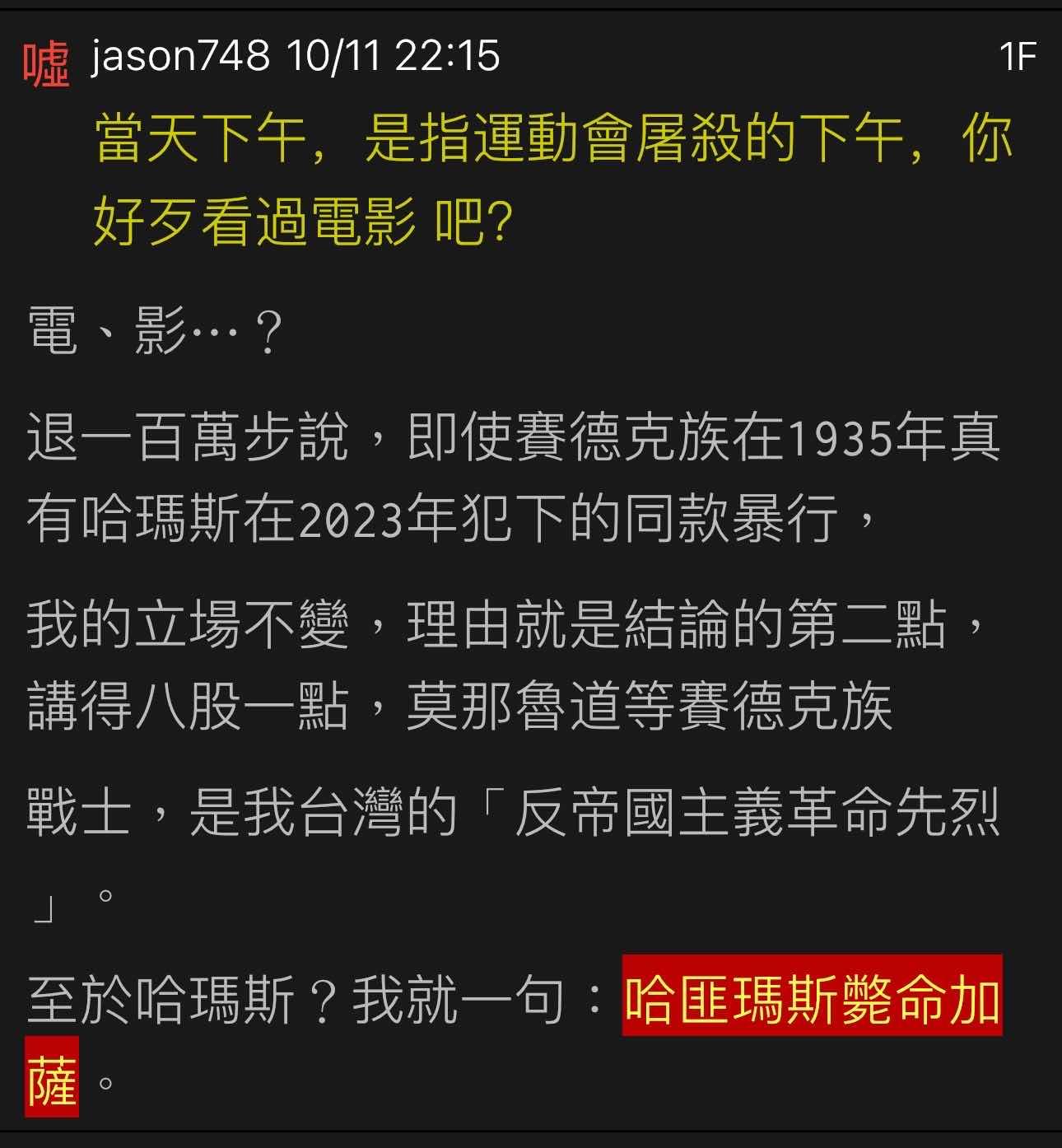 jason748 : 當天下午,是指運動會屠殺的下午,你好歹看過電影10/11 22:15