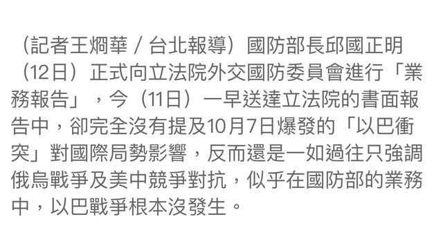 以巴衝突 邱國正:國防部成立專案小組研析 自由 巴勒斯坦激進組織哈瑪斯(Hamas)7日清晨大舉從加薩突襲以色列,造成以色列社區、軍隊大量死傷,以色列隨即宣戰。國防部長邱國正今指出,國防部也成立專案小組研析,初步得到「情報工作真的很重要」,因為情報有了後,可以預應,包含阻止戰爭發生。 立法院外交及國防委員會今邀請國防部長邱國正報告業務概況,並備質詢。邱國正今入會場前接受媒體聯訪,被詢問有關以巴衝突的相關議題。 邱國正表示,以巴戰爭爆發的蠻突然,各國都有軍事行動,國防部也成立專案小組研析,初步得到「情報工作真的很重要」,因為情報有了後,可以預應,包含阻止戰爭發生。 邱國正說,這兩天也看到媒體報導,尤其百姓無辜死傷,真的慘不忍睹,這也給我們啟示「備戰不求戰」,共同期望就是避免戰爭,這也是國軍有的態度,而國軍在這方面從早到晚沒停過,不抱著很樂觀或極度悲觀,任何一件事情都要有徵候,一分證據說一份話,嚴密監控徵候。 媒體關注以色列一天內動員30萬名後備軍人,國軍是否有同樣能力,邱國正指出,國軍都有動員規劃,一開始接到動員令,編實、戰耗補充,台灣地方不大,人員都有造冊可以定位,按照以往動員教育召集經驗,「報到率蠻高的」。 https://news.ltn.com.tw/amp/news/politics/breakingnews/4455976 = 自由 題外,本來周三菱傳媒報導過今天報告內容 說國防部不談以巴戰爭 https://i.imgur.com/wx4E2Hq.jpg