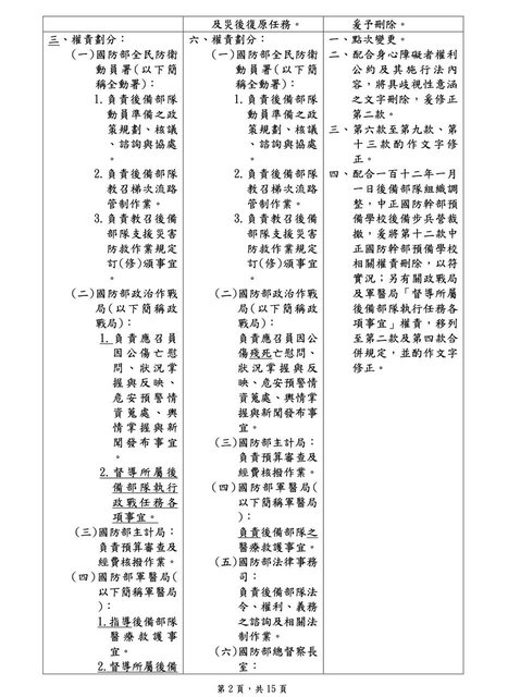 根據國防部所發佈之”國防部教育召集後備部隊支援災害防救作業規定修正對照表”中得知