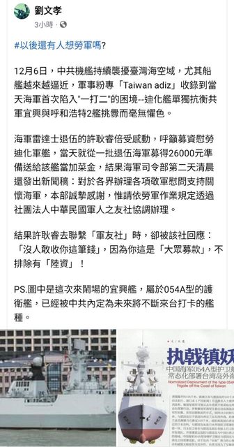→ jobli : 以後海軍收捐款,就是垃圾政治鬥爭 12/10 21:02
