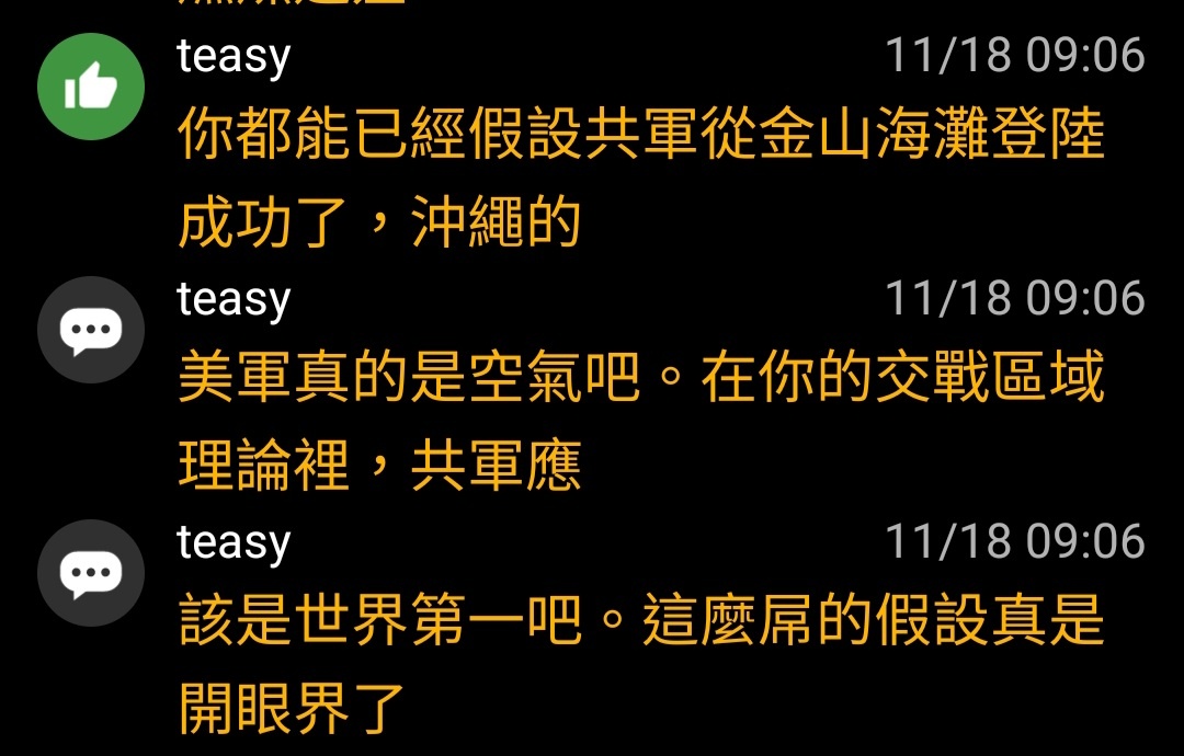 → teasy : 美軍真的是空氣吧。在你的交戰區域理論裡,共軍應 11/18 09:06