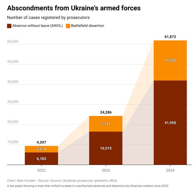 2024 年逃離前線或基地的部隊比例大幅上升