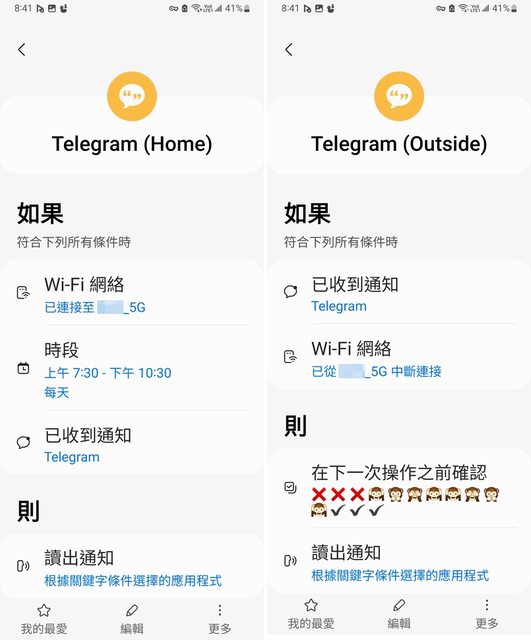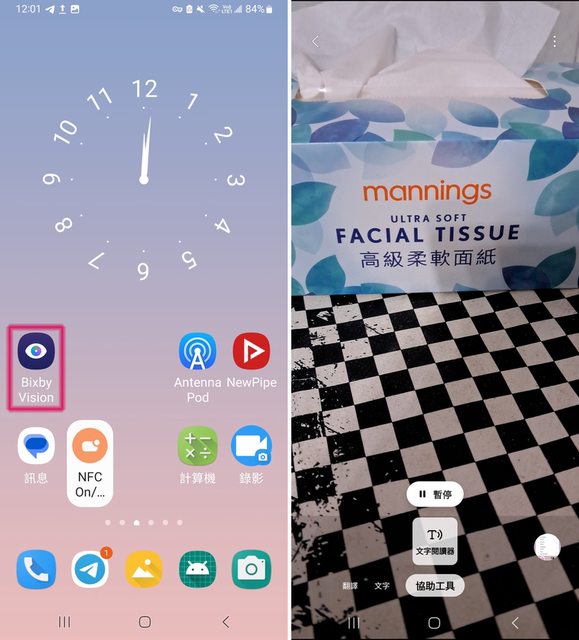 設定成用使用家中Wi-Fi時 會自動讀出通訊App傳來通知上的訊息; (當收到提及連結的訊息會很煩人;有時會失效, 不知是不是要取消「Routines」的電量限制,未研究) 而沒連接家中Wi-Fi時, 則可以透過彈出的選項選擇要不要讀出。 (怕他在公眾場所產生不必要的尷尬場面,最終停用了) 3.文字朗讀 「Bixby Vision」 https://i.imgur.com/YjVYvqs.jpg