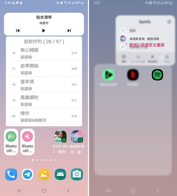 試過了很多款音樂播放器的App, 最終發現到「Musicolet」這個App最合適, 全因它的widget可以完整列出音樂庫清單, 無須打開App操作。 記憶卡裡的音樂他說聽膩了, 幫他把「Spotify」的每週新發現新增到主畫面去。 https://i.imgur.com/EDYtOVP.jpg
