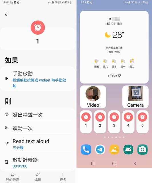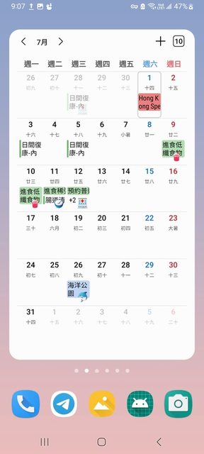 記性不好了,好幾次忘記關火關水。 打開「時鐘」弄計時器的步驟略多了點, 於是直接用「Routines」設定了 5至30分鐘共6組計時器並新增到主畫面去。 一按即倒數,會唸出選擇了什麼倒數時間以作防呆, 某程度上可能比實體的計時器還快捷點, 而關閉的方式跟拒接來電一樣簡單。 5.日曆 https://i.imgur.com/fYOPY0f.jpg