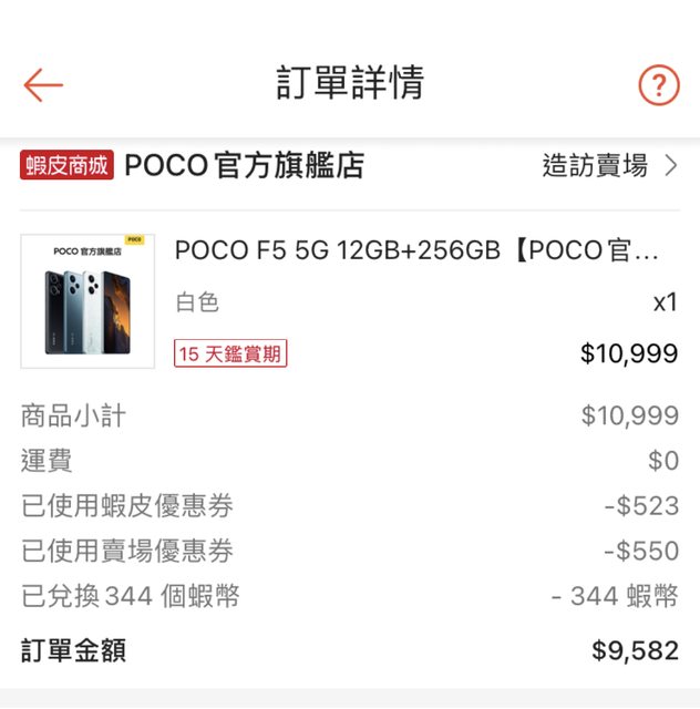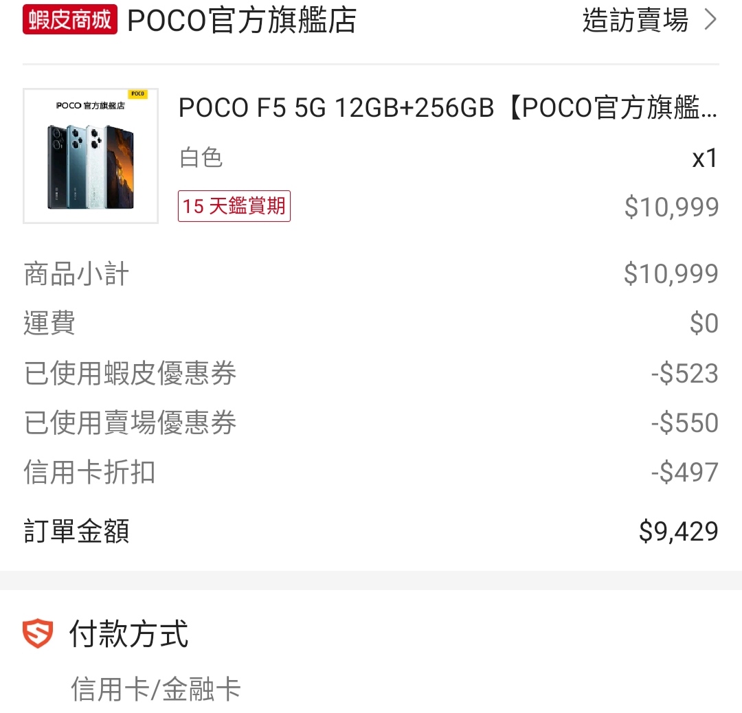 前文恕刪 今天蝦皮POCO官方旗艦店有一張95折券(終於有POCO F5可用券) 加上每週日固定一張商城95折券 疊加後接近9折,有比活動日93折好一些(85折機器人用不討論) 想下手POCO F5可以下手,白色也有補貨 倒是POCO F5 PRO還在缺貨= = https://i.imgur.com/CKfzsQz.jpg