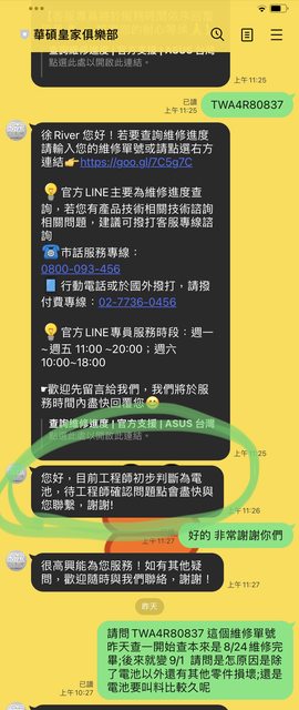 當下其實已有心理準備可能要被通知要換主機板的準備,但心裡仍保有一絲看是否有沒有可 能是電池故障的因素造成,於是在禮拜一上午在官方line詢問,工程師初步診斷故障原因為何 ?得到的回覆是就是電池因素,當下立馬稍微鬆口氣. https://i.imgur.com/IOX8Mfb.jpg