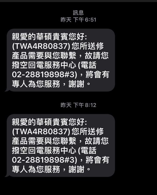 後來在8/22晚上在查維修進度,發現修理完成日期從原本8/24 延到9/1 ,心裡挫一下,該不會 又翻盤變主機板故障,然而就在今晚8/23手機沒放在身邊,沒注意有收到皇家俱樂部簡訊,? 求回電 如下 https://i.imgur.com/TJdRPBp.jpg