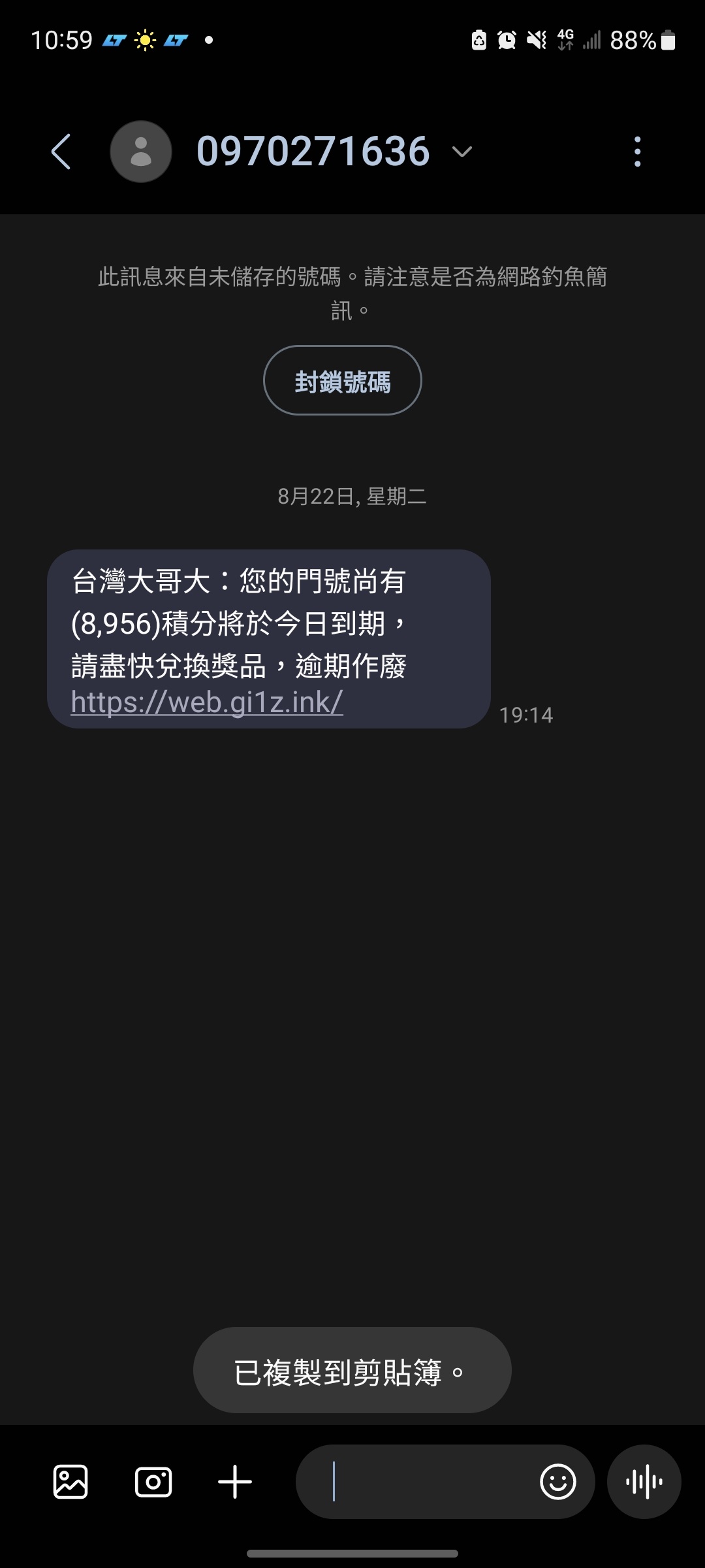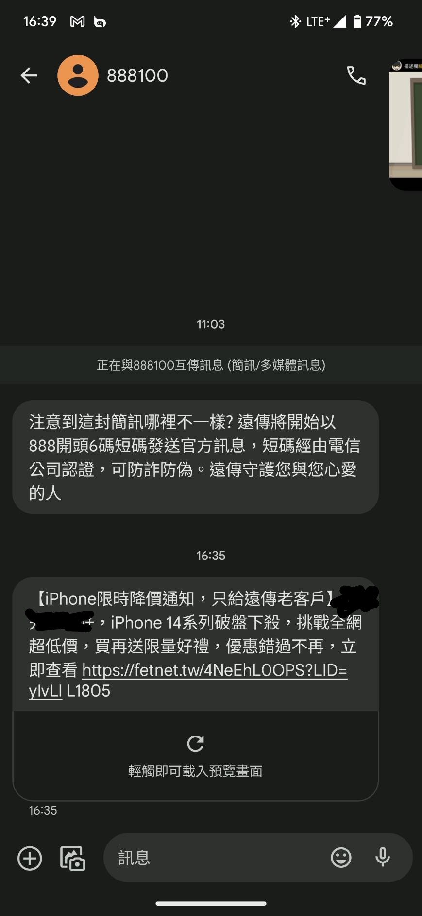 lolicat : 有收到假冒台灣大哥大傳的 但我早NP了 一看就是詐騙 08/27 14:19