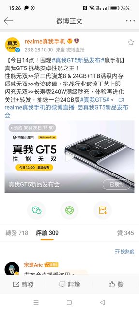 主要規格:高通驍龍8處理器;24GB+1TB內存;6.74吋1.5K直屏;240W秒充 4.直播網址:連結過長者請使用短網址。 真我官方微博 ---- Sent from BePTT on my Realme RMX3561 -- ※ 發信站: 批踢踢實業坊(www.ptt.org.tw), 來自: 123.204.230.127 (臺灣) ※ 文章網址: https://www.ptt.org.tw/MobileComm/M.1693201436.A.DEC