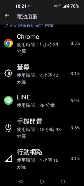 各位好,這兩天剛入手ZF9 看評價都是很省電 但是自己用的時候發現 只是看網頁/ptt/twitter等(沒有影片) 大概10分鐘左右就會掉1% 這樣感覺跟舊手機(ZF3)差不多 是正常的嗎?@@ 電池是用長續航模式 比較耗電的設定也有關掉 (定位,wifi,螢幕亮度等) 找不出特別耗電的程式 https://i.imgur.com/1YRGWTQ.jpg